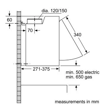 - Ducting diameter: 150 mm (120 mm enclosed)
